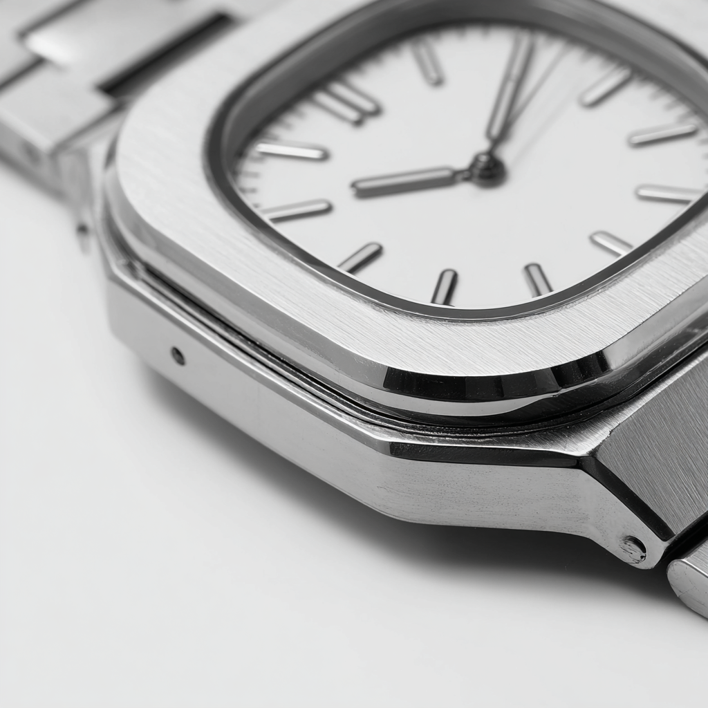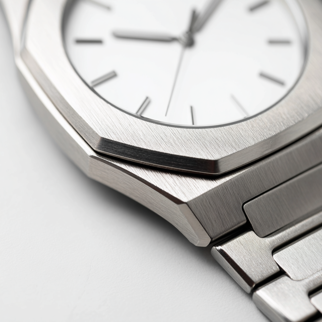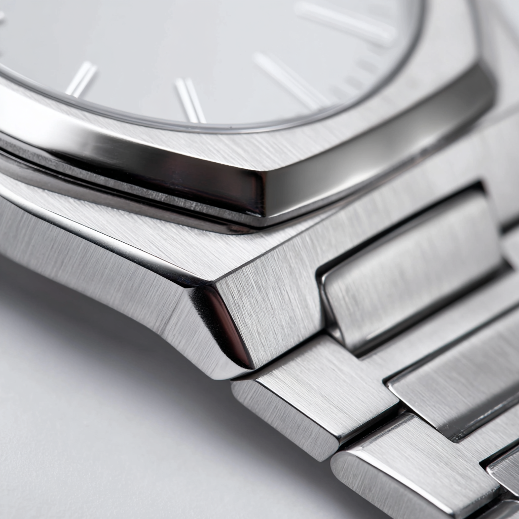 A direct replacement bezel for our modification kits. Machined from a solid block of 316L surgical grade stainless steel. The surface features a distinct vertical brushed finish that catches the light beautifully, contrasting with the polished beveled edges.